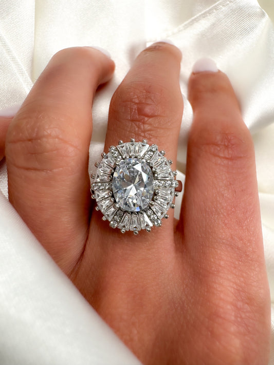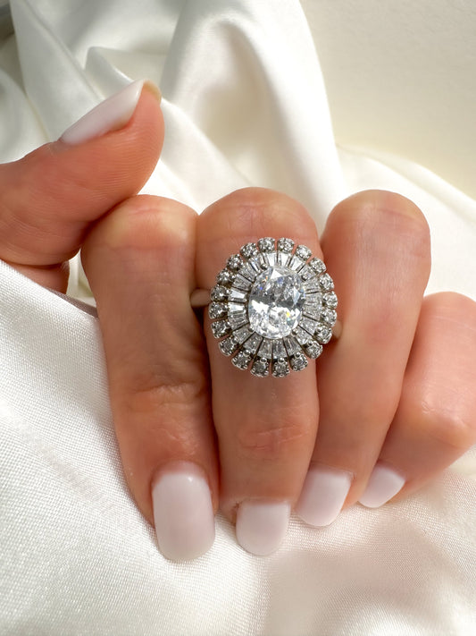 Oval-Cut Halo Sterling Silver Ring, size 7.25