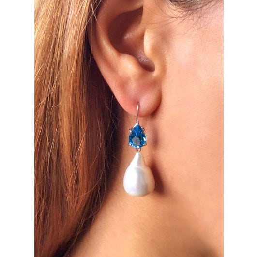 14k Solid Gold Blue Topaz & Baroque Pearl Earrings