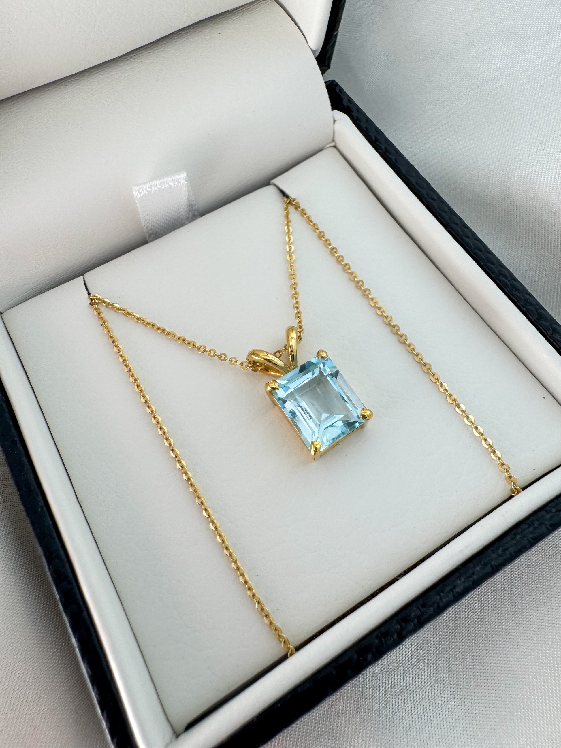 This elegant pendant features a stunning emerald cut sky blue topaz, set in a 14k solid gold 4-prong setting for a timeless and sophisticated look. Sky blue topaz is known for its serene, calming hue, symbolizing clarity, communication, and tranquility.