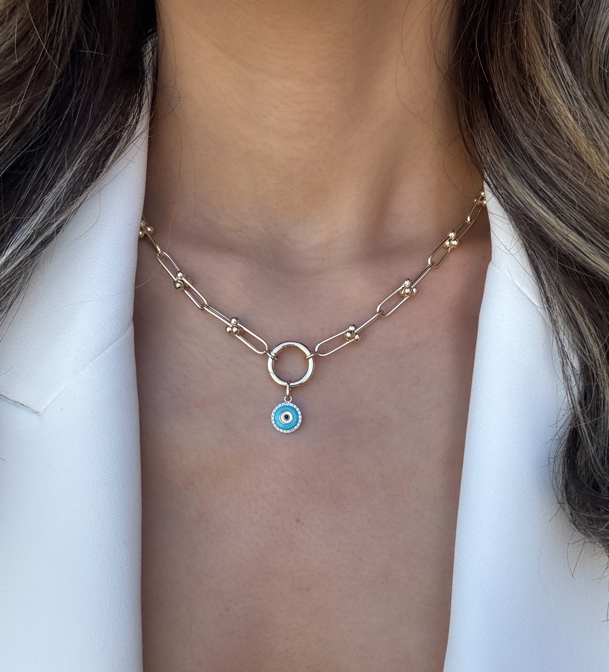 A handcrafted 14k solid gold evil eye pendant designed with natural turquoise, onyx, and diamond accents. This classic protection amulet is believed to enhance good luck and ward off negative energy. Made with care in our Los Angeles studio.