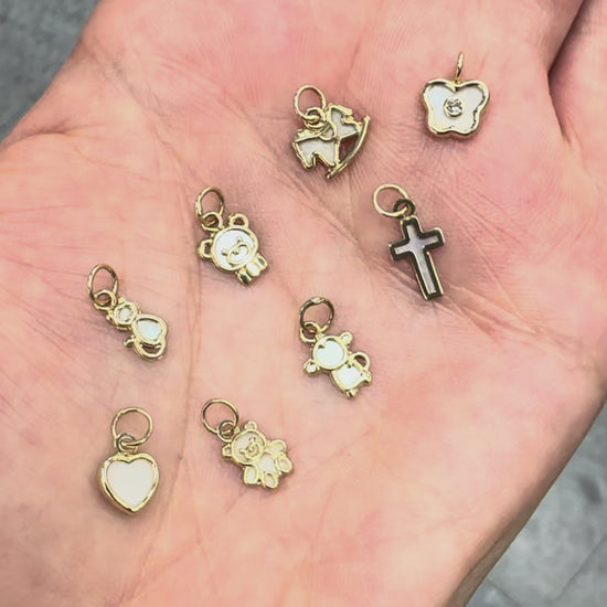 Handcrafted in solid 14k gold and accented with luminous natural Mother of Pearl, these dainty charms add a touch of elegance and meaning to any necklace or bracelet.