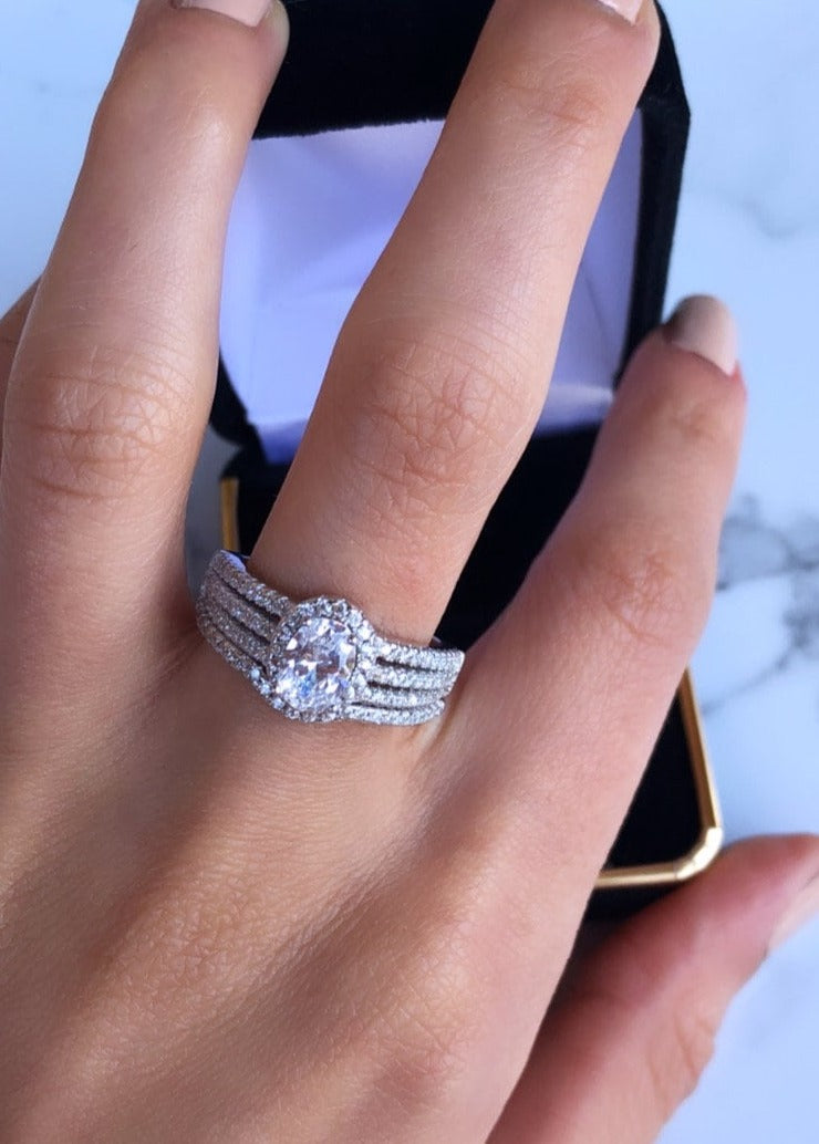 Oval Cut Halo Sterling Silver Engagement Ring With Matching Band, Size 7
