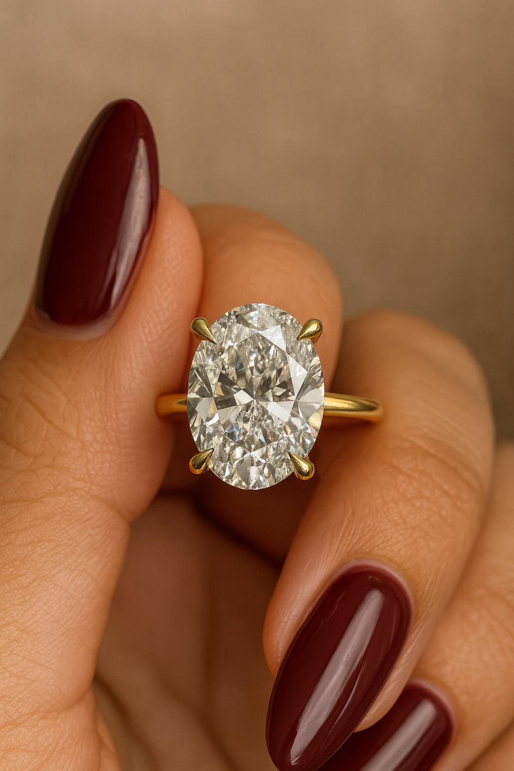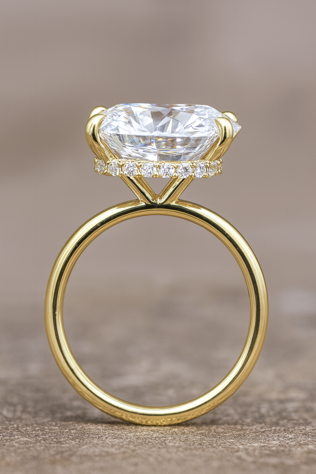 This 4 carat oval cut lab grown diamond engagement ring features a timeless solitaire look with a sparkling hidden halo beneath the center stone. The hidden halo adds brilliance from every angle while keeping the design sleek and elegant. Crafted in 14k solid yellow gold, the secure 4 prong setting showcases the diamond’s fire and brilliance, making it a perfect choice for proposals, anniversaries, or special occasions.