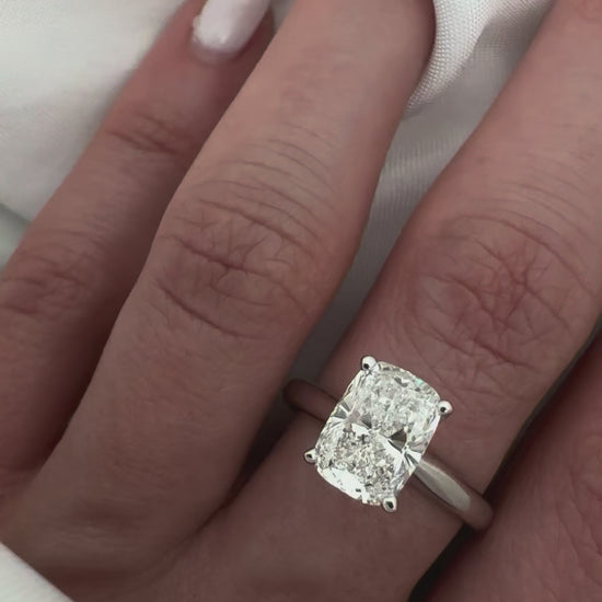 ◆ This elegant cushion cut solitaire engagement ring features a brilliant lab grown diamond set in a classic 4-prong setting on a sleek high-polish band. The timeless design highlights the stone’s fire and brilliance while maintaining a refined, minimalist look, perfect for modern brides who love understated luxury.