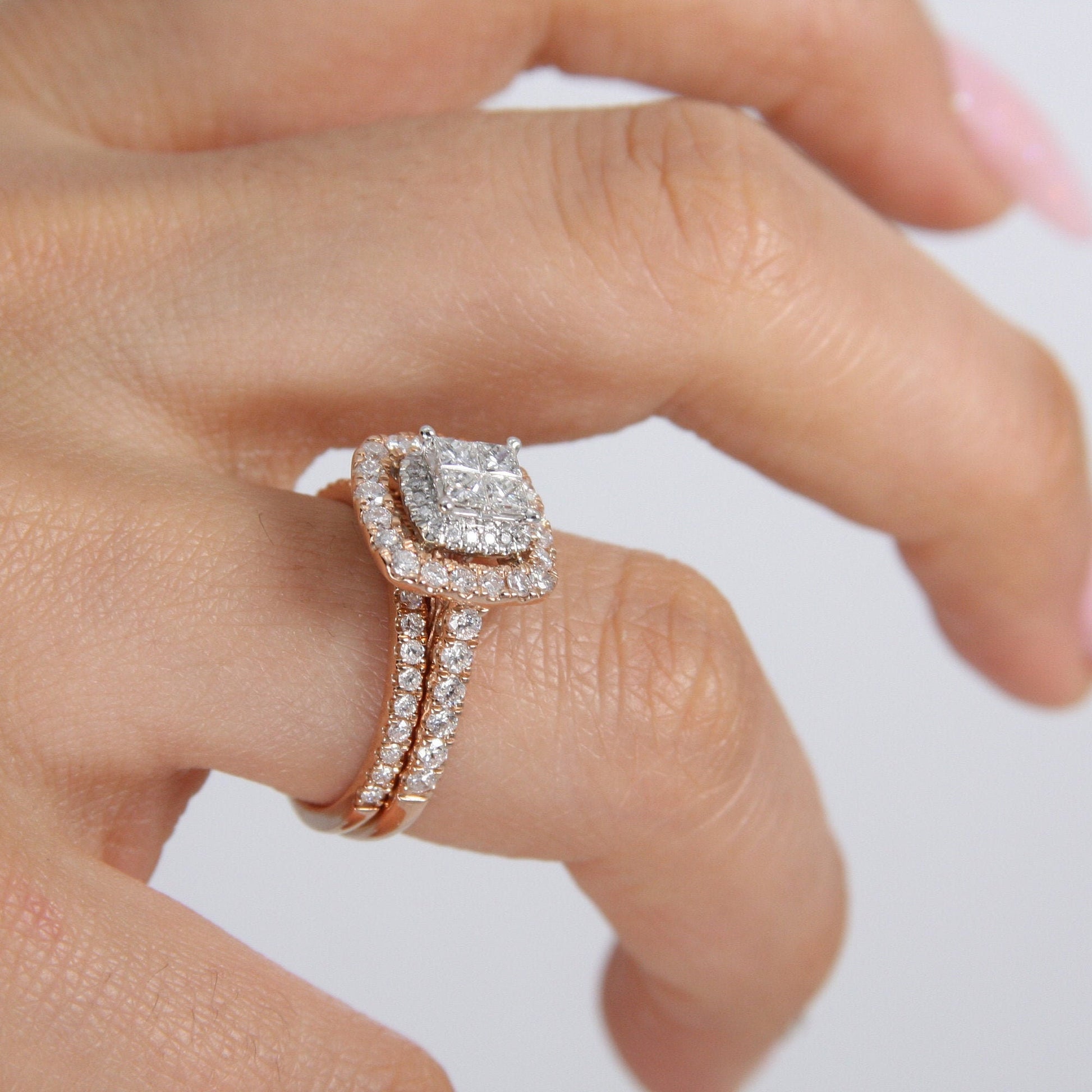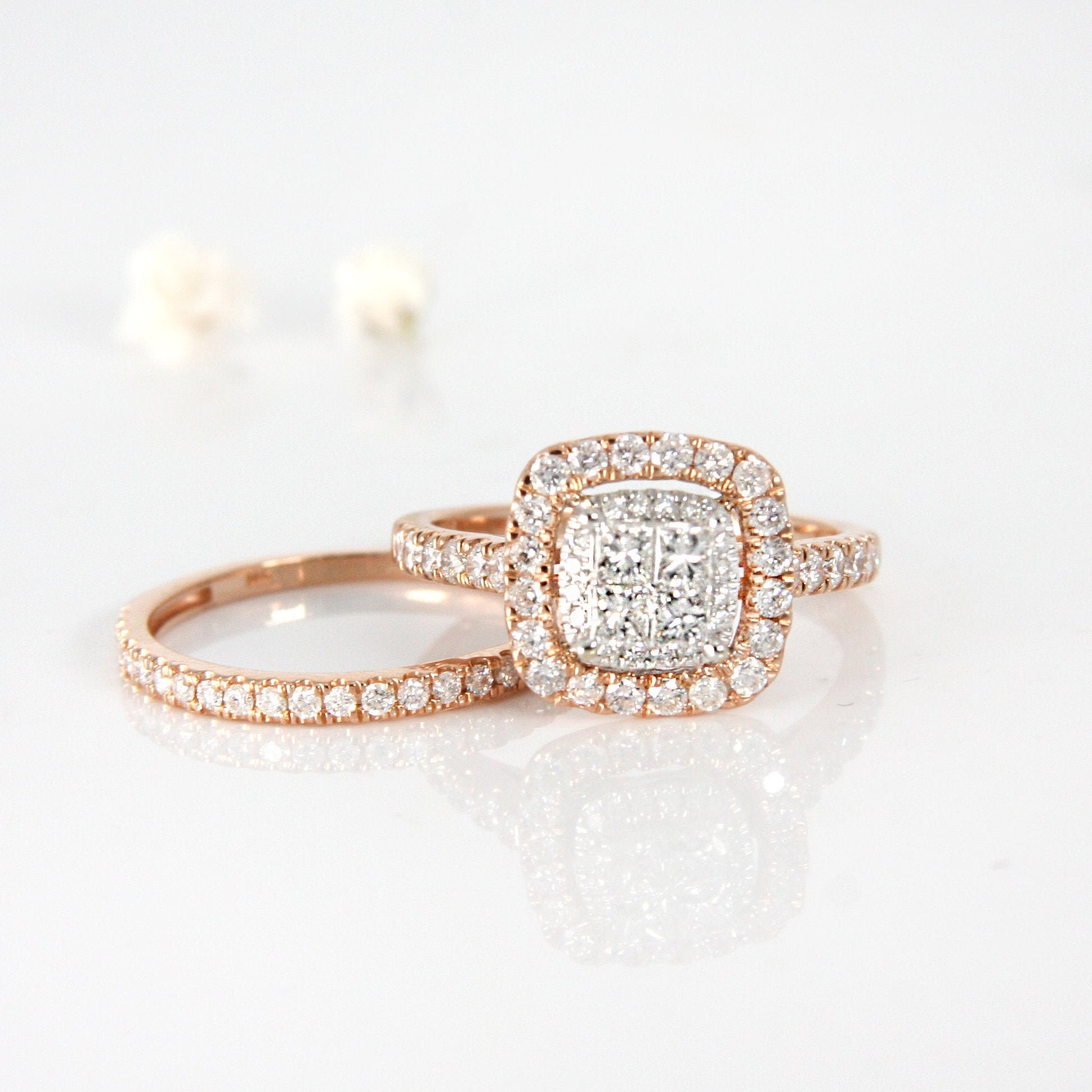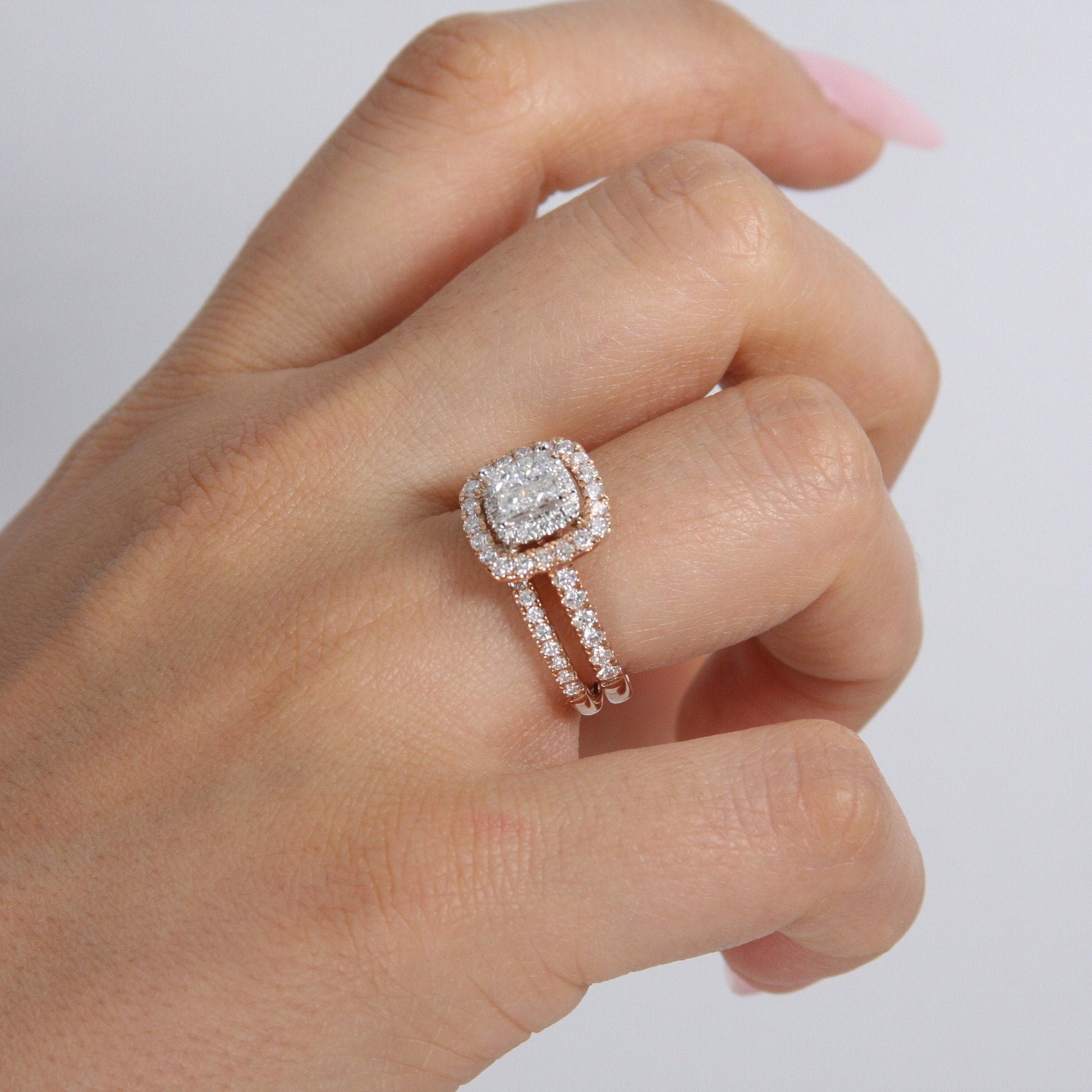 This stunning bridal ring set is crafted in 14k solid rose gold and features a cushion-style center made from four princess-cut natural diamonds, framed by a halo of sparkling natural diamond accents. The set is completed with a perfectly matched diamond pave wedding band. Elegant, timeless, and full of brilliance, this design blends classic luxury with a modern silhouette. A perfect choice for engagement, wedding, or a meaningful anniversary gift.