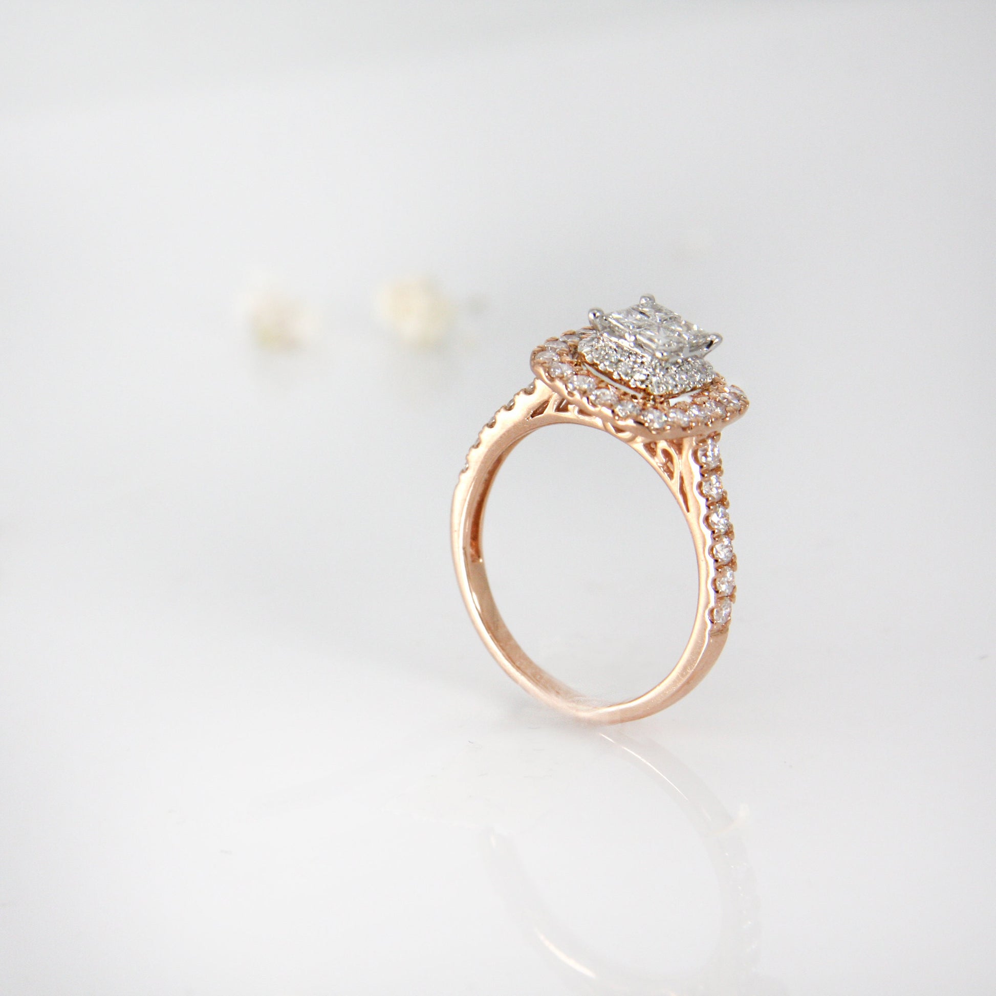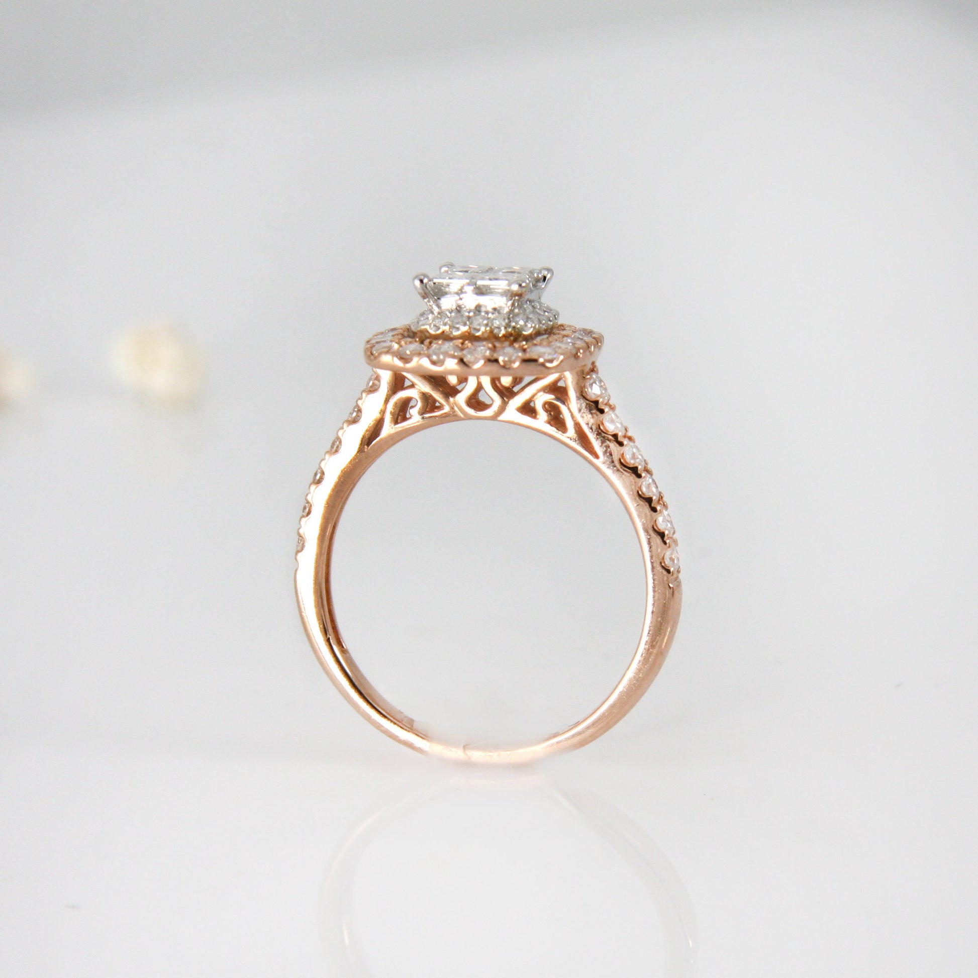 Princess Cut Cluster Halo Ring in 14k Rose Gold, Cushion Style Engagement Ring