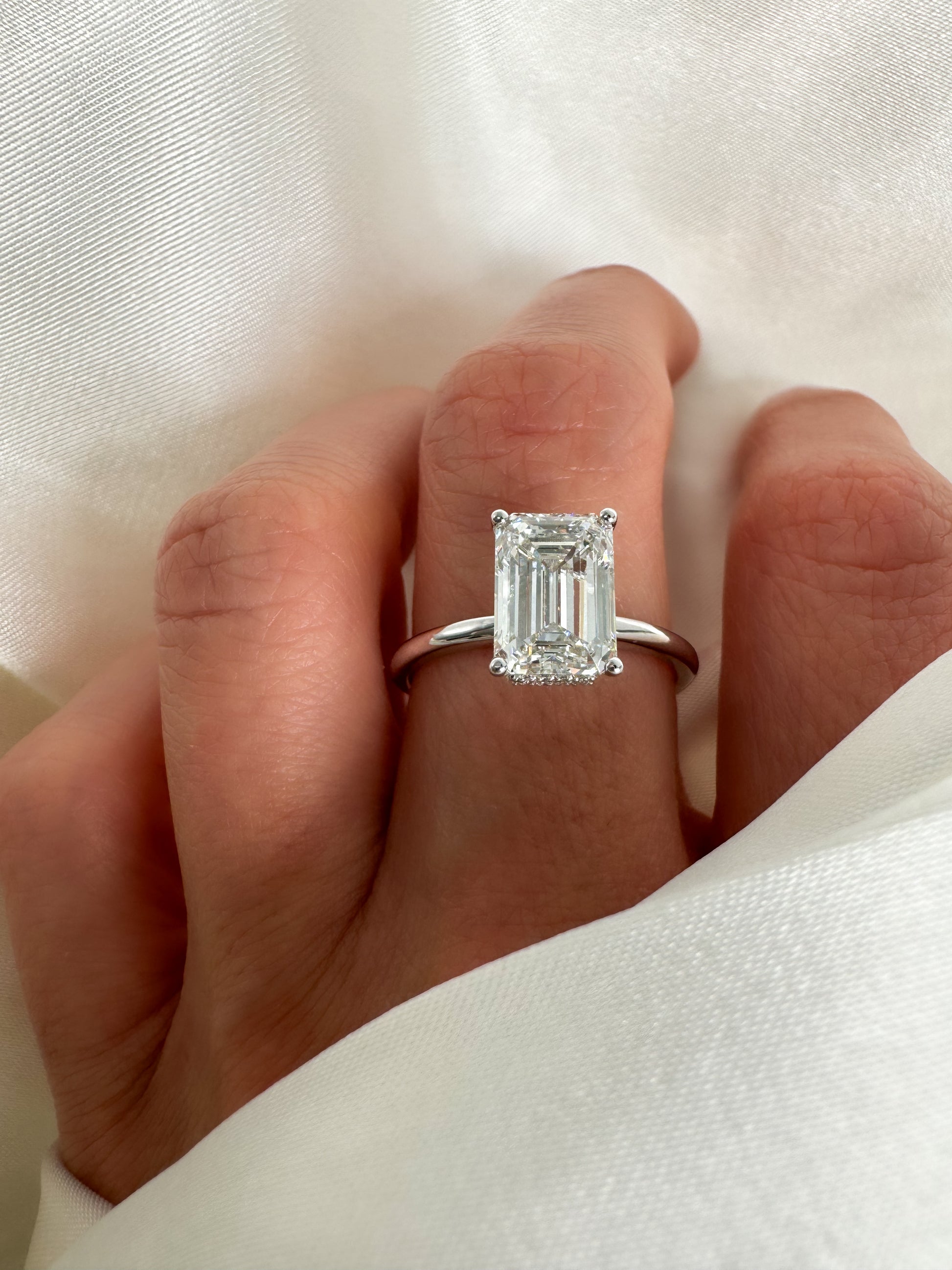 This emerald-cut engagement ring features an invisible (hidden) halo design that adds extra sparkle while keeping the center stone the focus. The clean, elegant setting sits low and comfortable on the finger, perfect for everyday wear. Available in 10k, 14k, or 18k solid gold, this timeless design is ideal for brides who love a modern, refined, and luxurious look with added brilliance from the hidden halo.