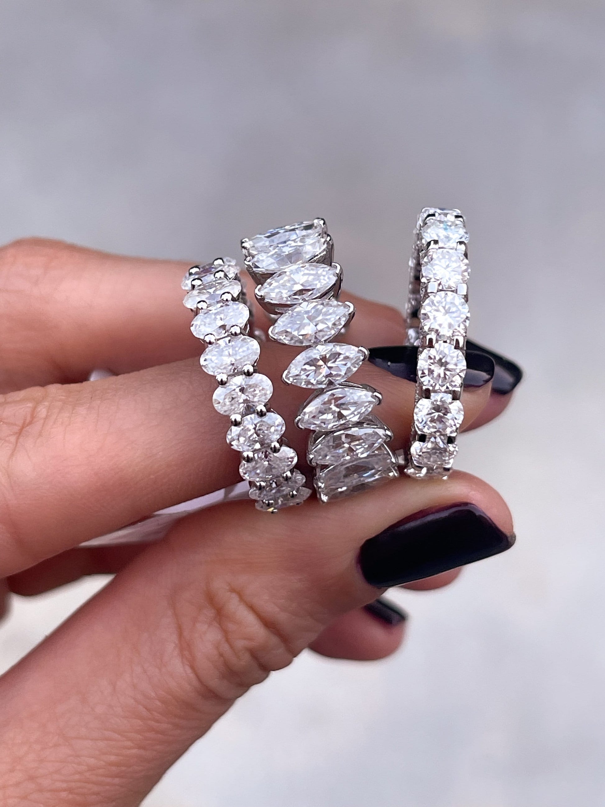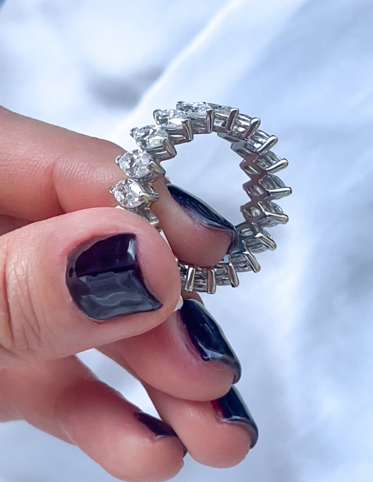 This exquisite full eternity band features marquise cut moissanite stones, meticulously set in 14k solid gold for a dazzling and timeless design. Each stone is hand-selected for maximum brilliance, creating an elegant sparkle from every angle. Perfect as a wedding band, anniversary ring, or statement piece, this eternity band symbolizes everlasting love and sophistication.
