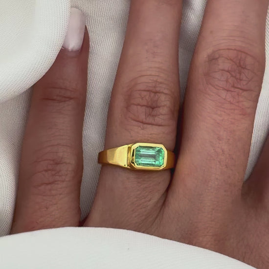 Natural Colombian Emerald Signet Solitaire Ring, 14k Gold Bezel Setting