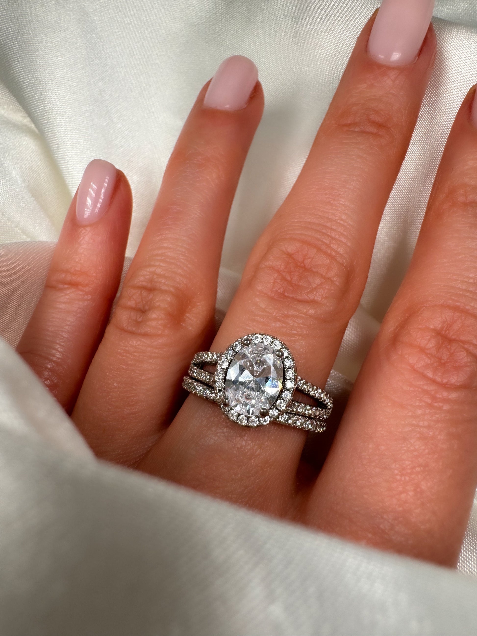 Oval Cut Halo Sterling Silver Engagement Ring With Matching band, size 5.75