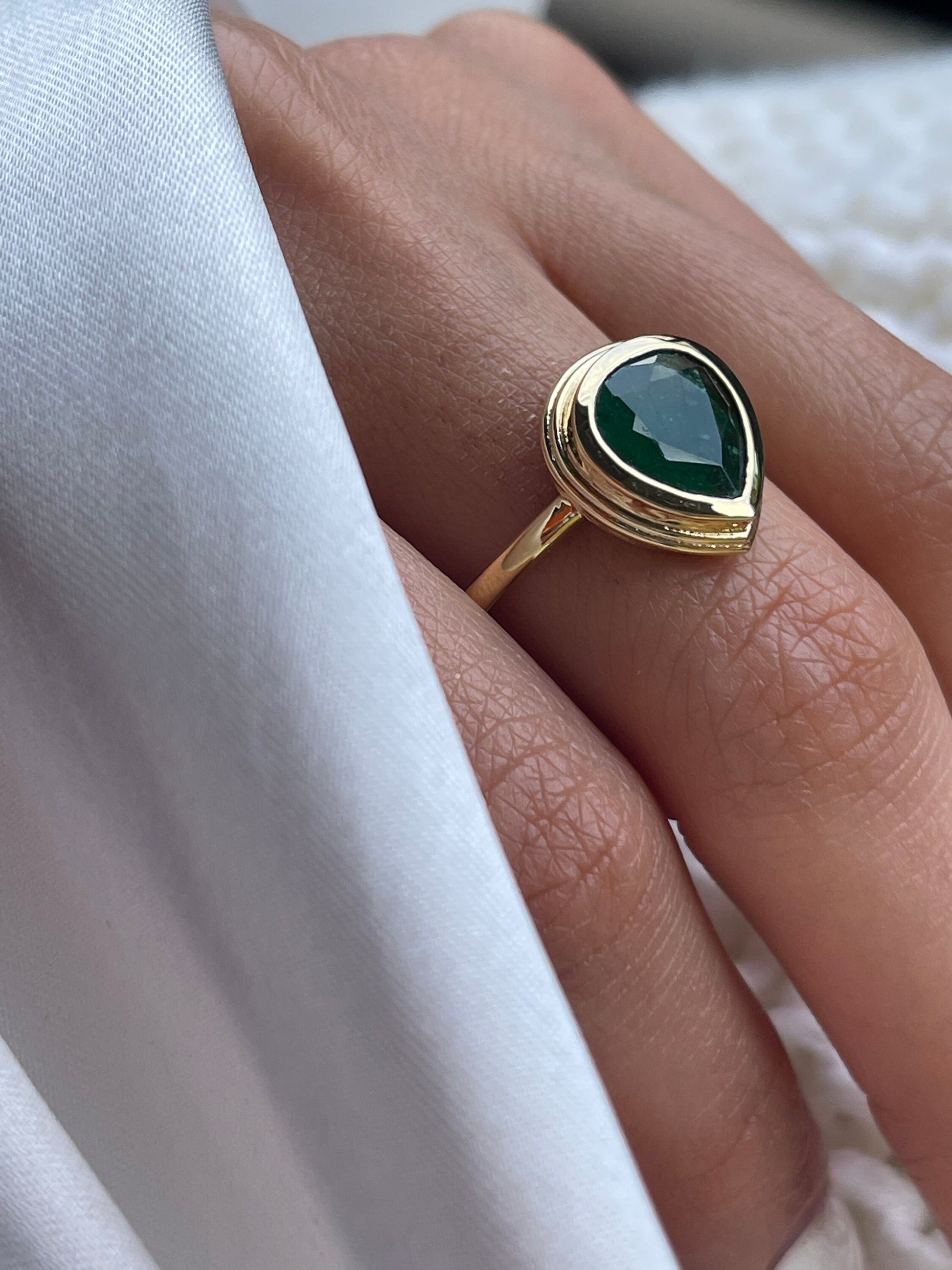 Natural Pear Shaped Emerald Bezel Setting Solitaire Ring in 14k Solid Gold
