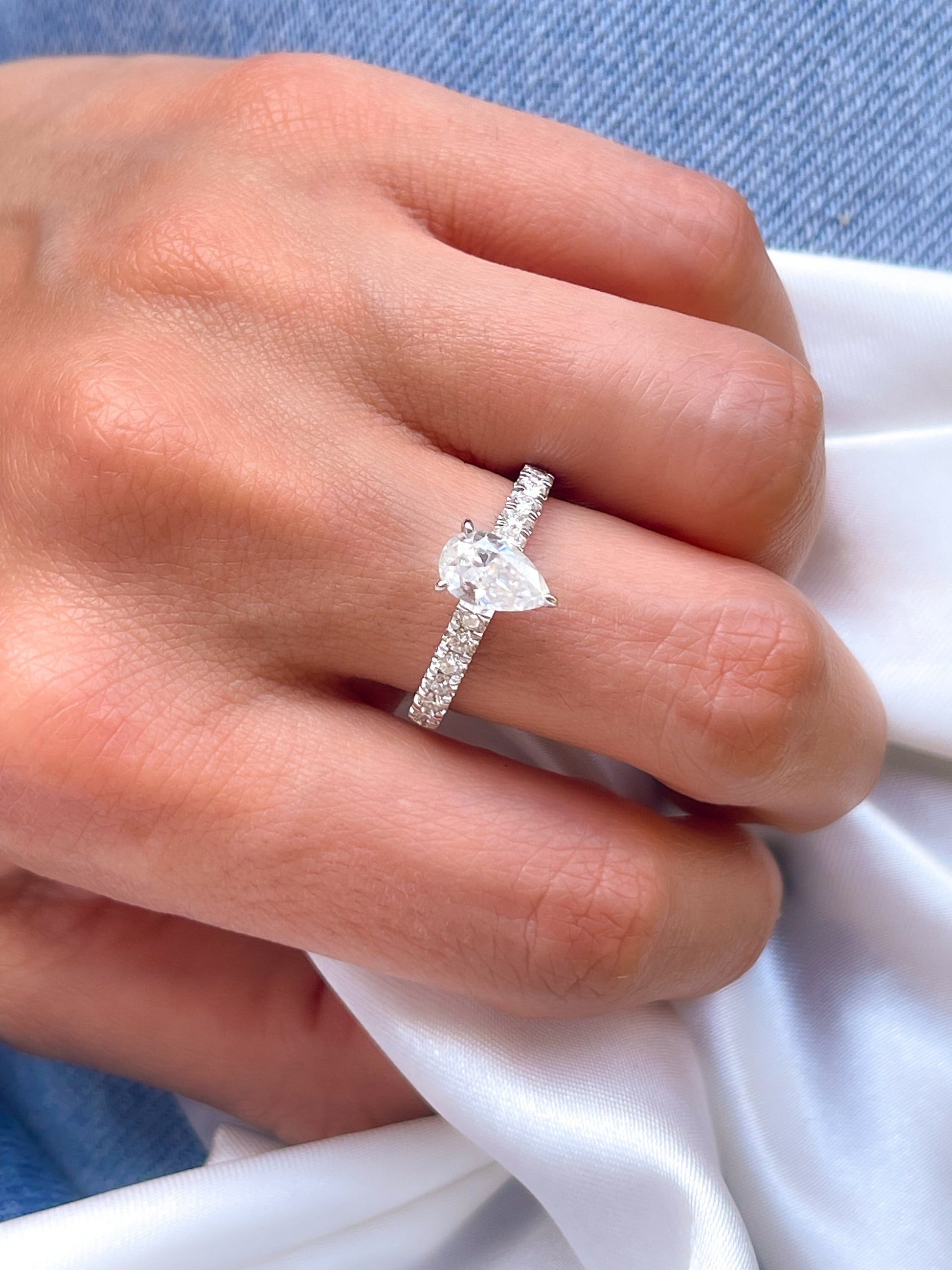 - Center stone: Pear Shaped Moissanite