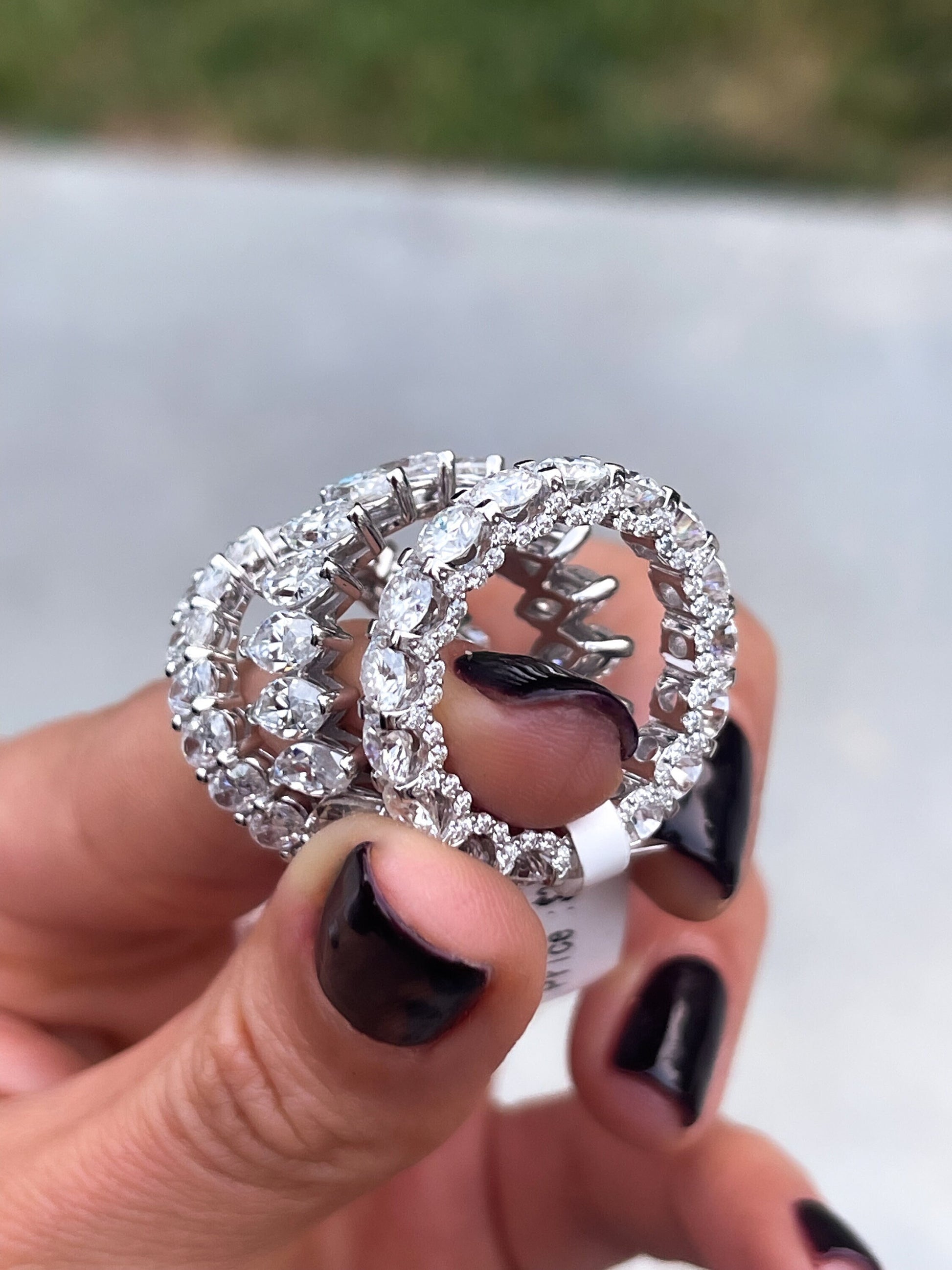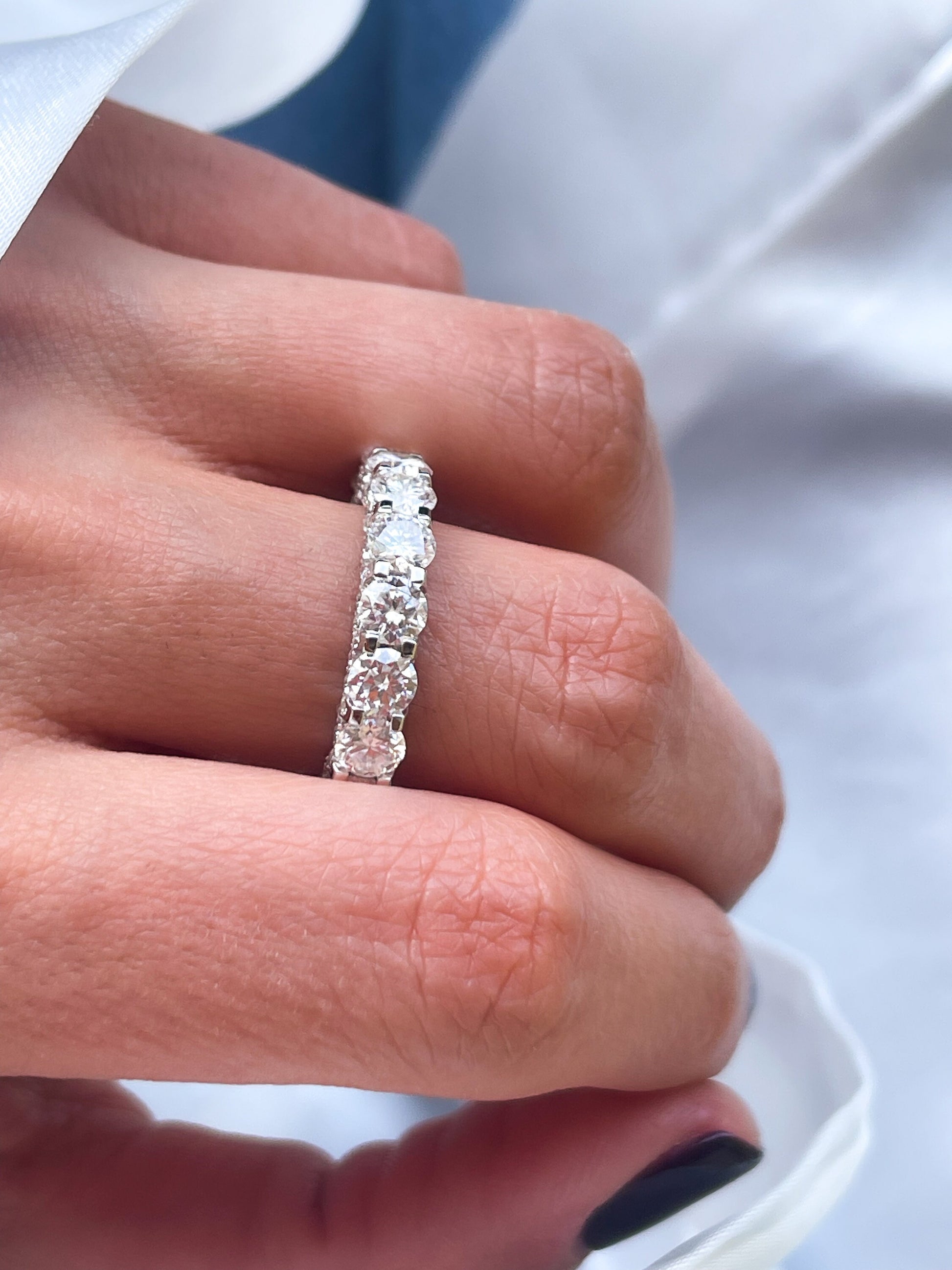 The U-shaped shared prong design allows maximum light to enter each stone, giving the ring an impressive fire and brilliance comparable to natural diamonds. Perfect as a wedding band, anniversary ring, or statement stacking piece, this ring offers both modern glamour and classic sophistication.