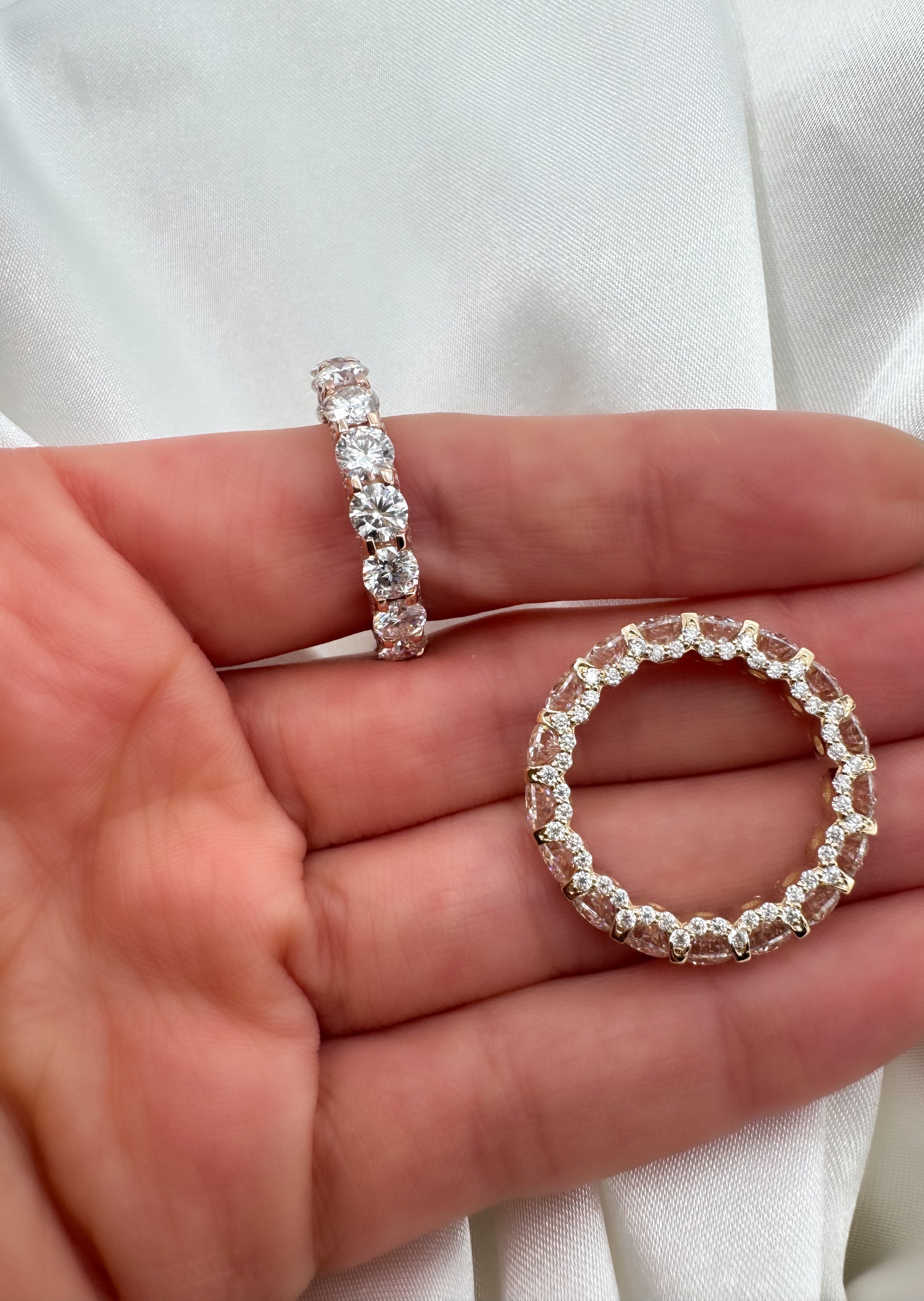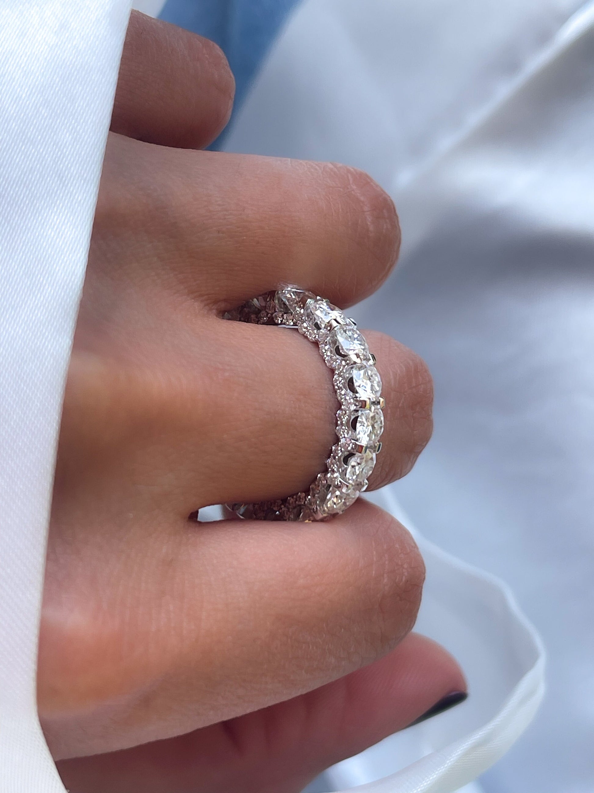 Timeless elegance meets brilliant sparkle in this U-shape prong full eternity band, featuring round-cut moissanites set all the way around the band for a continuous circle of light. Each stone is individually hand-set in solid 14K gold, creating a luxurious, high-end look that radiates from every angle.