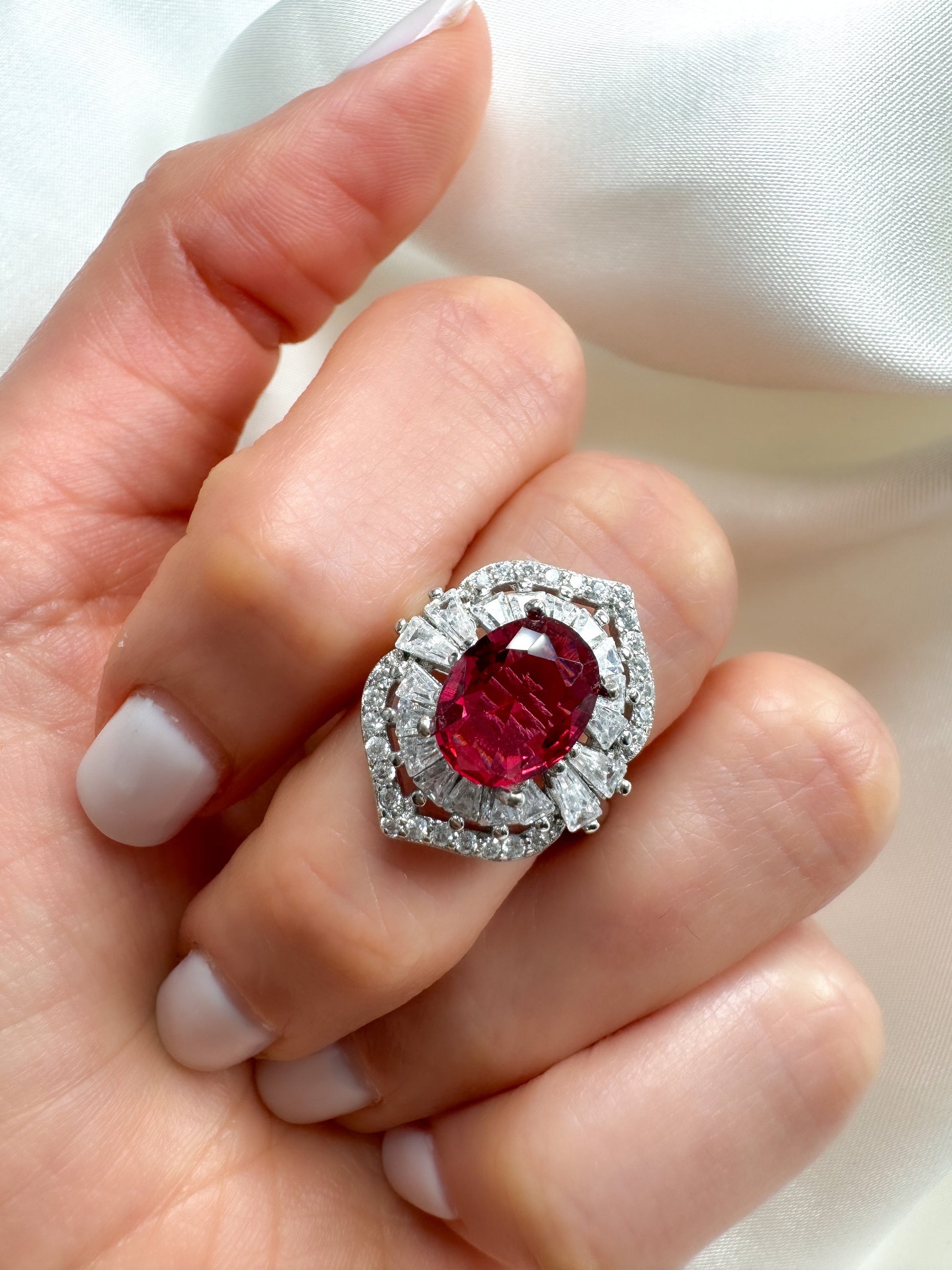 This glamorous sterling silver cocktail ring showcases a vibrant oval cut simulated ruby, framed by a dazzling halo of baguette and round simulated diamonds in a unique geometric design. Finished with rhodium plating for extra shine and durability, this bold statement ring captures the look of luxury fine jewelry at an affordable price. Perfect as a vintage inspired cocktail ring, anniversary gift, or elegant evening accessory, this red gemstone halo ring is designed to turn heads with timeless sophistication.