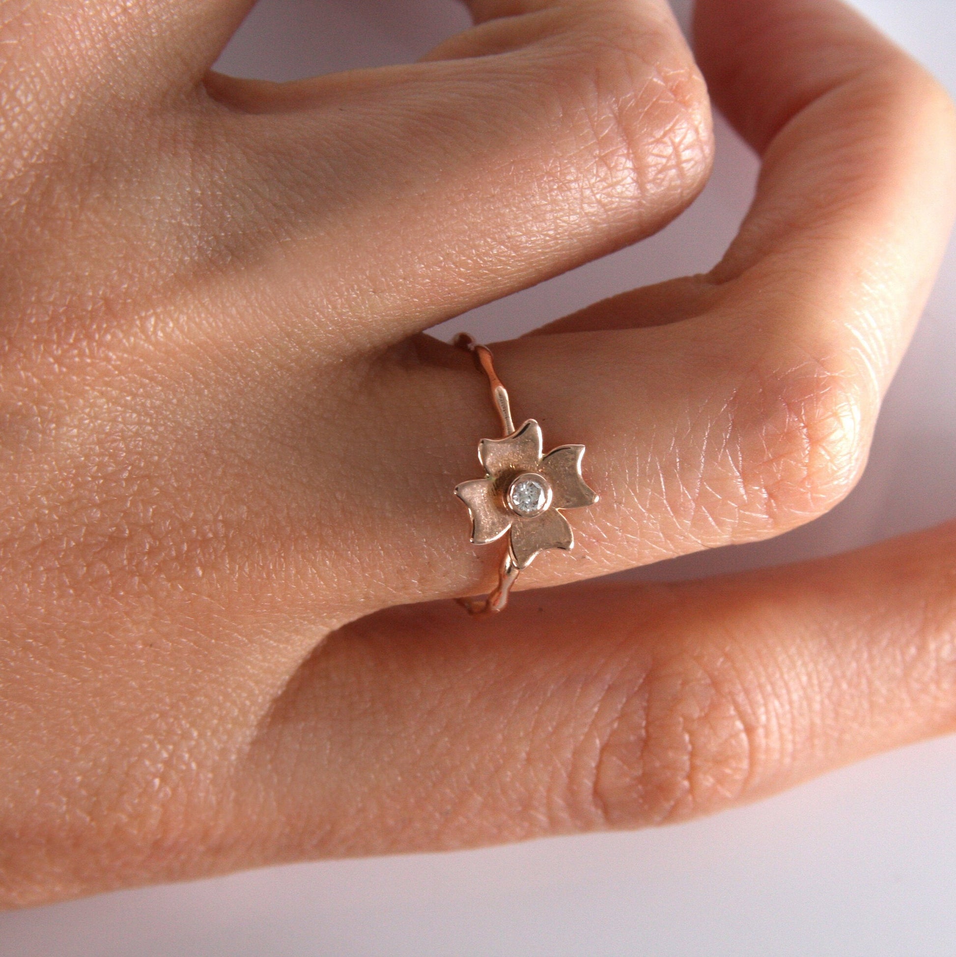 ✿ DELICATE SOLID GOLD FLOWER RING WITH NATURAL DIAMOND.